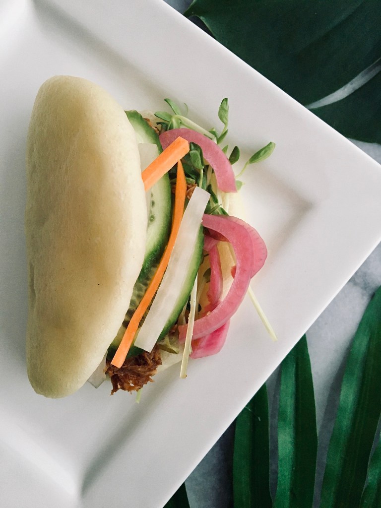 - Anything goes for the filling. These were filled with pulled pork with do chua (daikon and carrot pickles), pickled red onions, cucumbers, pea shoots, then drizzled with hoisin and sriracha.