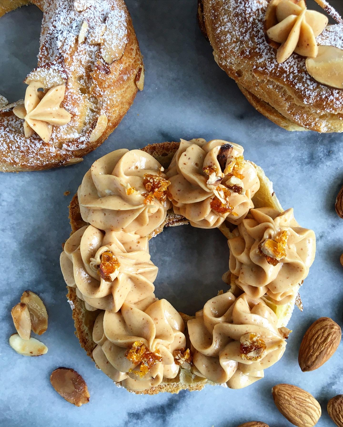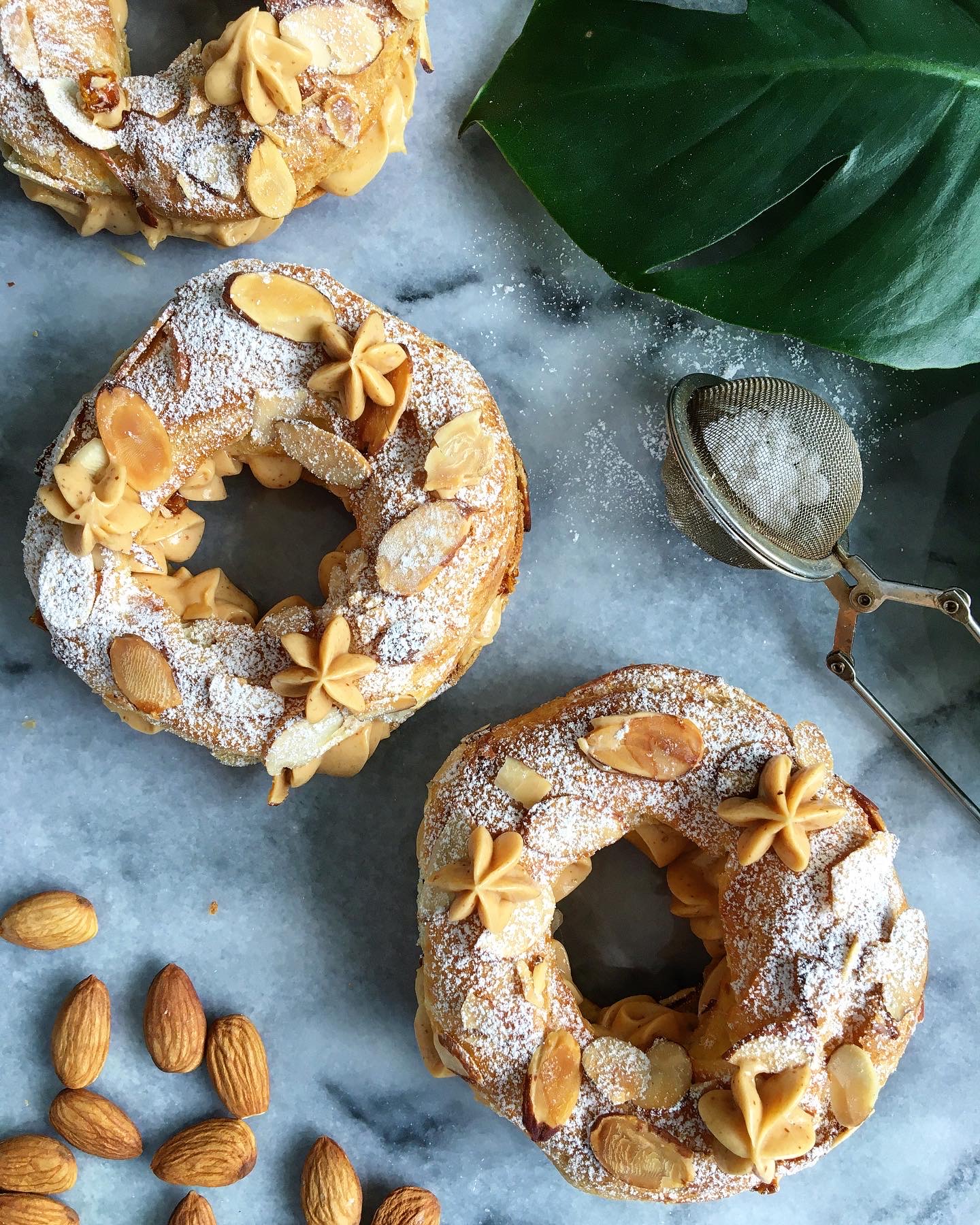 - Add the top back and if you want to get creative you can add another little piping of of cream and or more crushed praline and or finish with another dusting of icing sugar. Et voila! Bon appetit!
